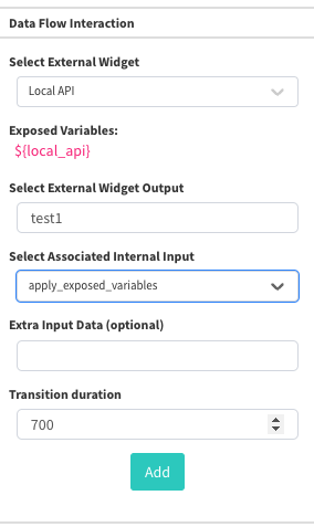 For example, if you had a control system interface with two buttons, one said "Hi" and the other says "World", you could go to a text widget, add an external widget of Local API to the DFI, look for "button1" and another that has the output of "button2" (respectively). Then the text widget would have ${local_api} in its text to know that it needs to wait for a value from the local API.