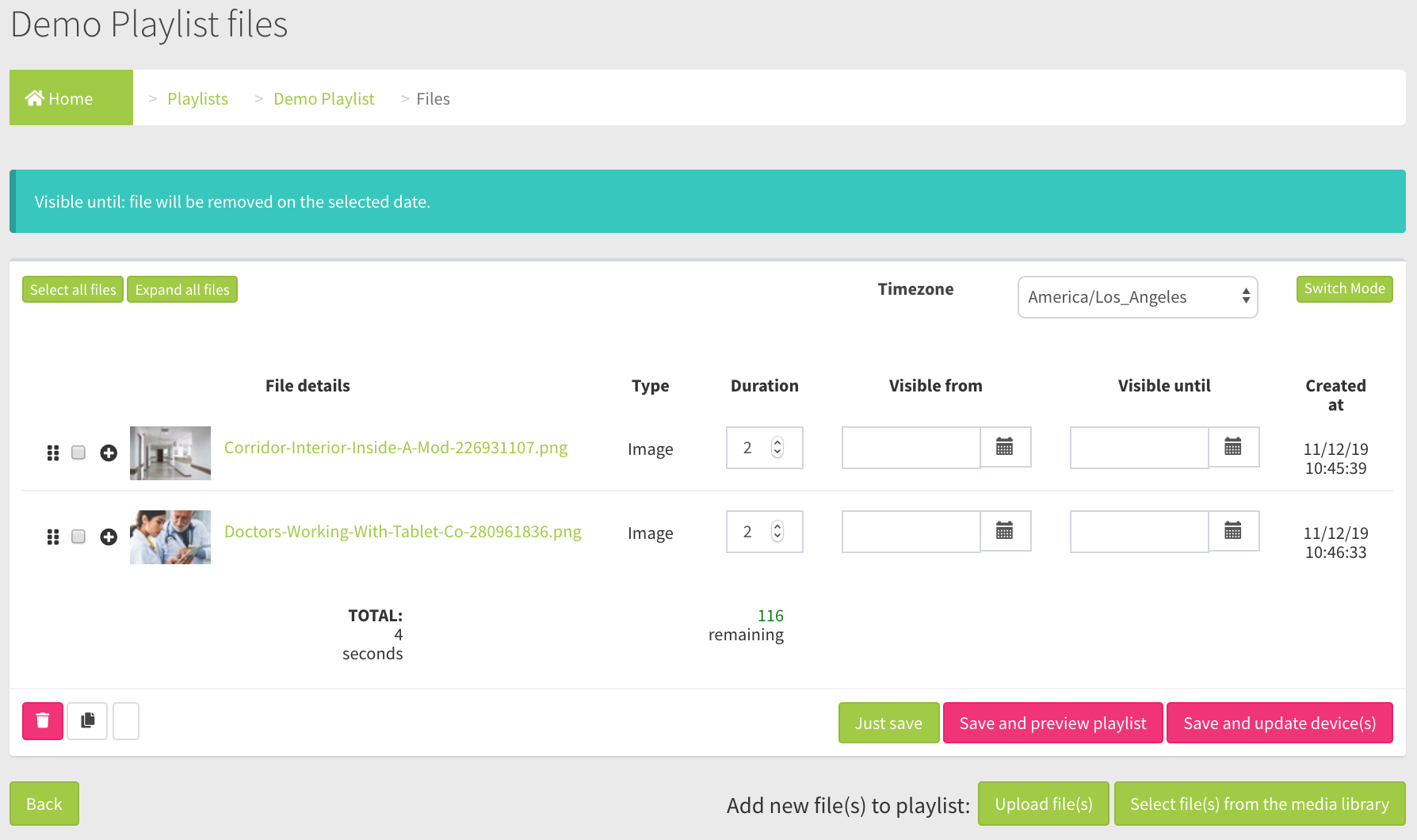 Click the Select file(s) from the media library button to select and use files that have already been uploaded. This feature is particularly useful if you've uploaded a large file and don't wish to spend time uploading again. More information on the Playlist Media Library Upload Page.