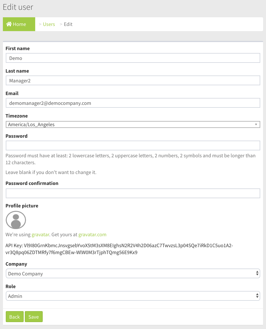 The password for the user. When creating the user a placeholder password can be assigned. Note that security requirements standardize password strength with 12 characters or more including 2 lowercase, 2 uppercase, 2 numbers and 2 symbols.